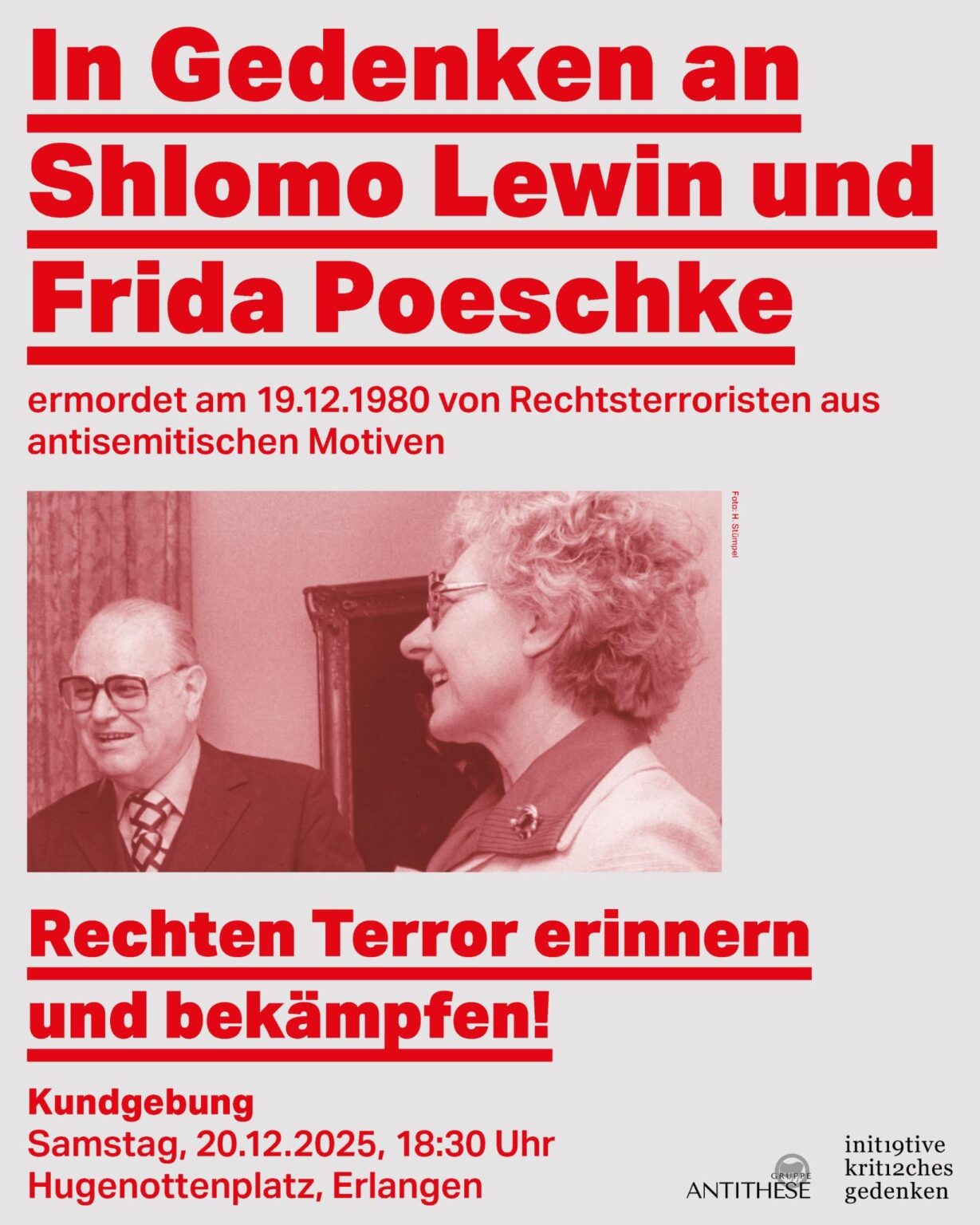 45 Jahre ohne Frida Poeschke und Shlomo Lewin. Am 19. Dezember 1980 wurden die beiden aus antisemitischen Motiven in Erlangen ermordet. Der Täter: Burschenschafter und Mitglied der neonazistischen Wehrsportgruppe Hoffmann. Die Ermittlungsbehörden zogen einen antisemitischen Hintergrund lange Zeit nicht in Betracht, die Erlanger Stadtgesellschaft kehrte recht schnell zum Alltag zurück. Shlomo Lewin und Frida Poeschke gerieten daraufhin lange in Vergessenheit. Das erst 2010 wieder einsetzende Gedenken seitens der Stadt Erlangen war immer wieder von Entpolitisierung geprägt. Dagegen richten sich seit 2012 antifaschistische Gruppen mit einer jährlichen Gedenkkundgebung. … weiterlesen aufkritischesgedenken.de Infos zur Wehrsportgruppe Hoffmann – „Vereinigung der Einzeltäter“