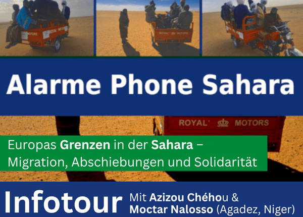 22.04.26 | 19:30 | Infoladen Luitpoldstr. 15, Erlangen Die europäischen Grenzpolitiken enden nicht an den Außengrenzen der EU. Deals mit Staaten in Nord- und Westafrika zielen schon weit südlich der Mittelmeerküste auf repressive Kontrolle von Migration und Flucht – mit verhängnisvollen Folgen für Menschen auf der Flucht. Tausende sterben nicht nur im Mittelmeer oder im Atlantik, sondern auch auf den Routen durch die Sahara. Alarme Phone Sahara (APS) arbeitet u.a. in Agadez und im Norden Nigers, um Menschen zu helfen, die auf diesen Routen in Not geraten.